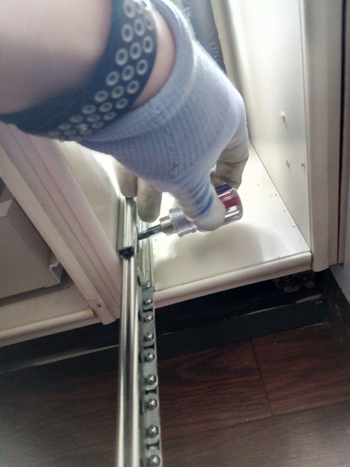 下端にスライドレールを取り付けます。狭いところで力をこめてタッピングビスをとめるのが大変!