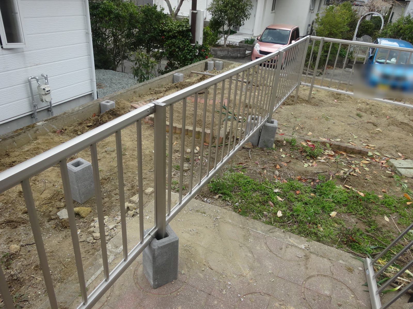 生垣を撤去する際に土をどけておけば、基礎を埋める丁度いい穴が開いている筈です。柱が位置する所に印をつけておいて、高さが既存ブロック塀から数センチ下がるように、砂利とモルタルで固定します。数センチ下げたのは後で防草シートと人工芝を敷く為で、そのままでいいのなら塀と面一でも構わないと思います。